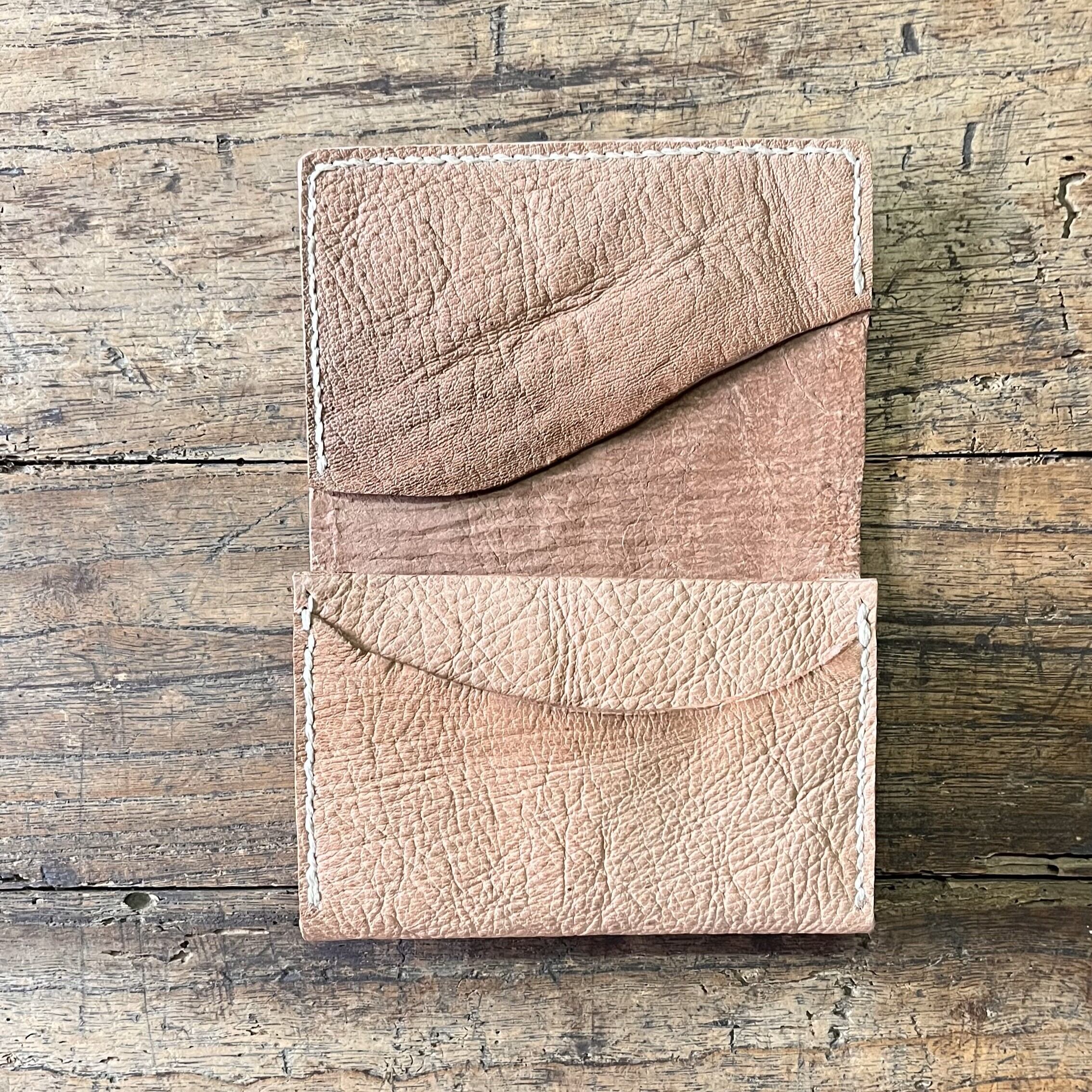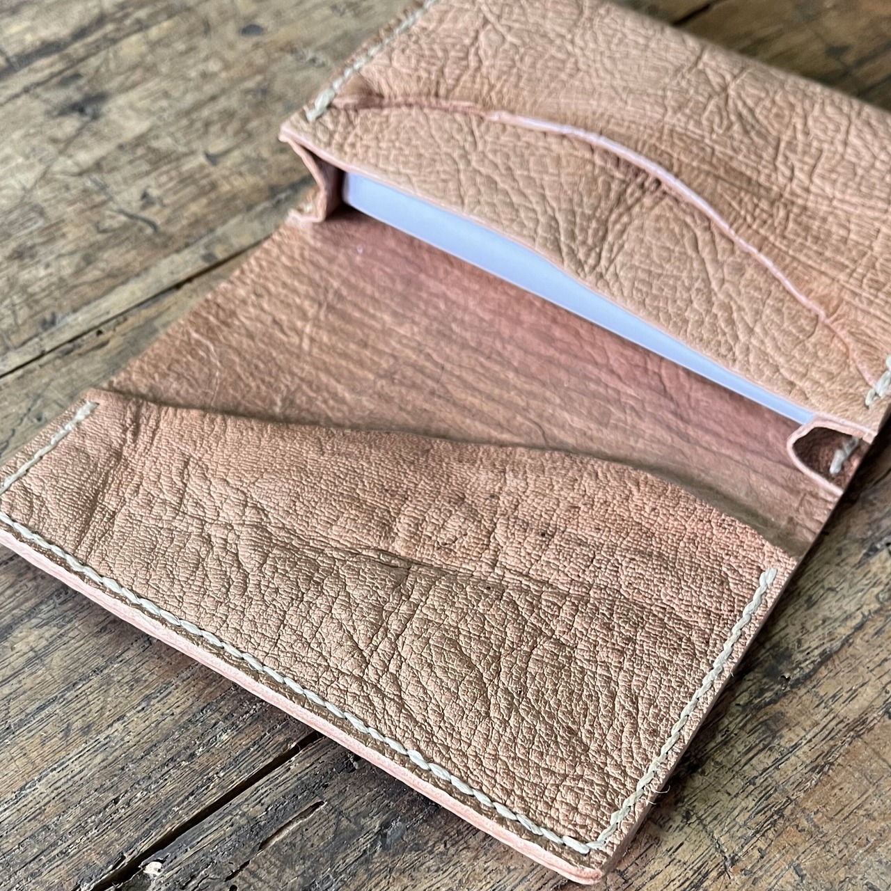 Made from deerskin tanned using the "pit tanning" method, this card holder offers both softness and durability. The natural characteristics of the leather—including edges, pores, stains, and scratches—are preserved, creating a unique texture and distinctive look. Over time, the leather develops a richer color and sheen, gradually adapting to your touch and becoming a one-of-a-kind business card holder.