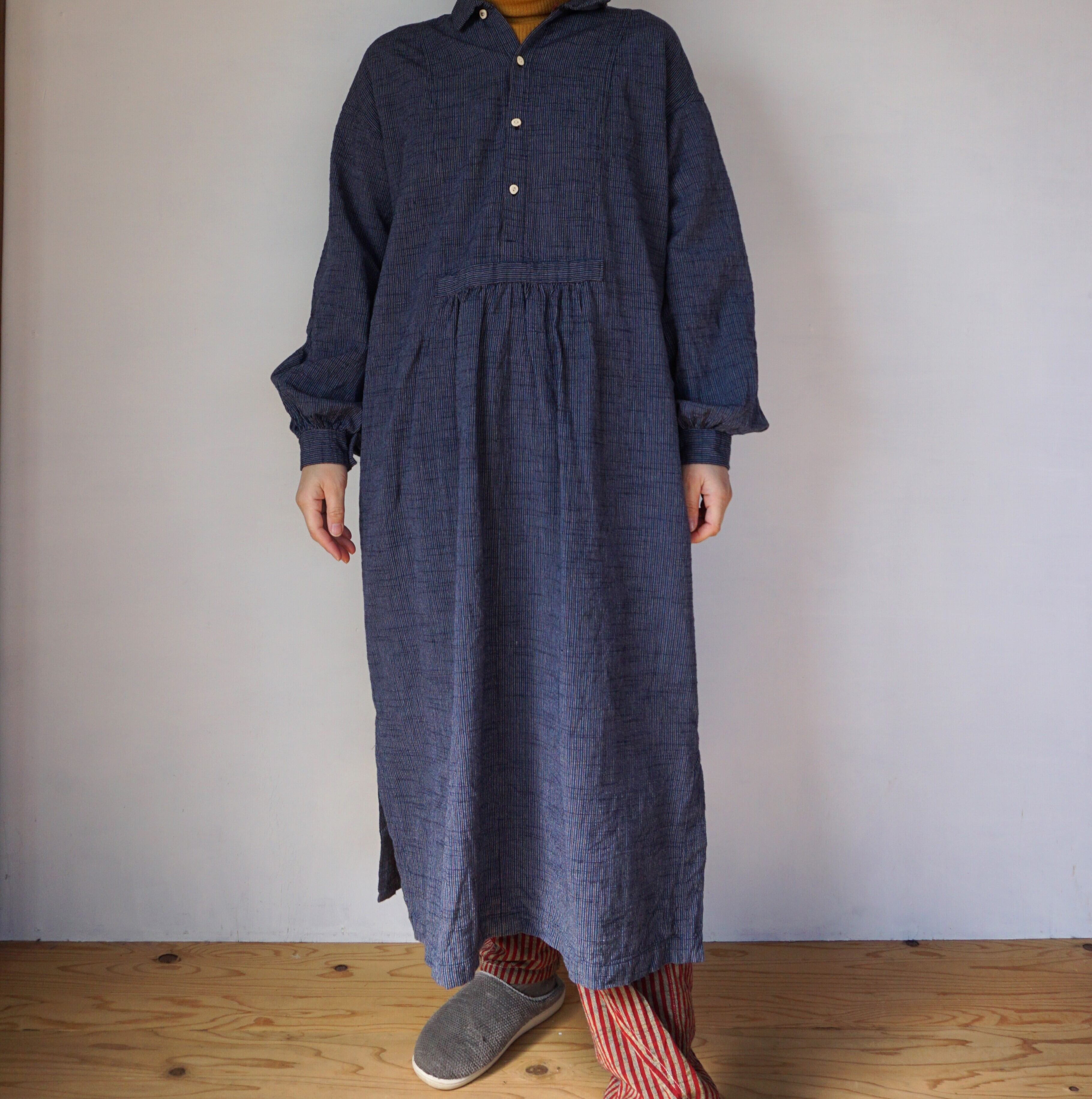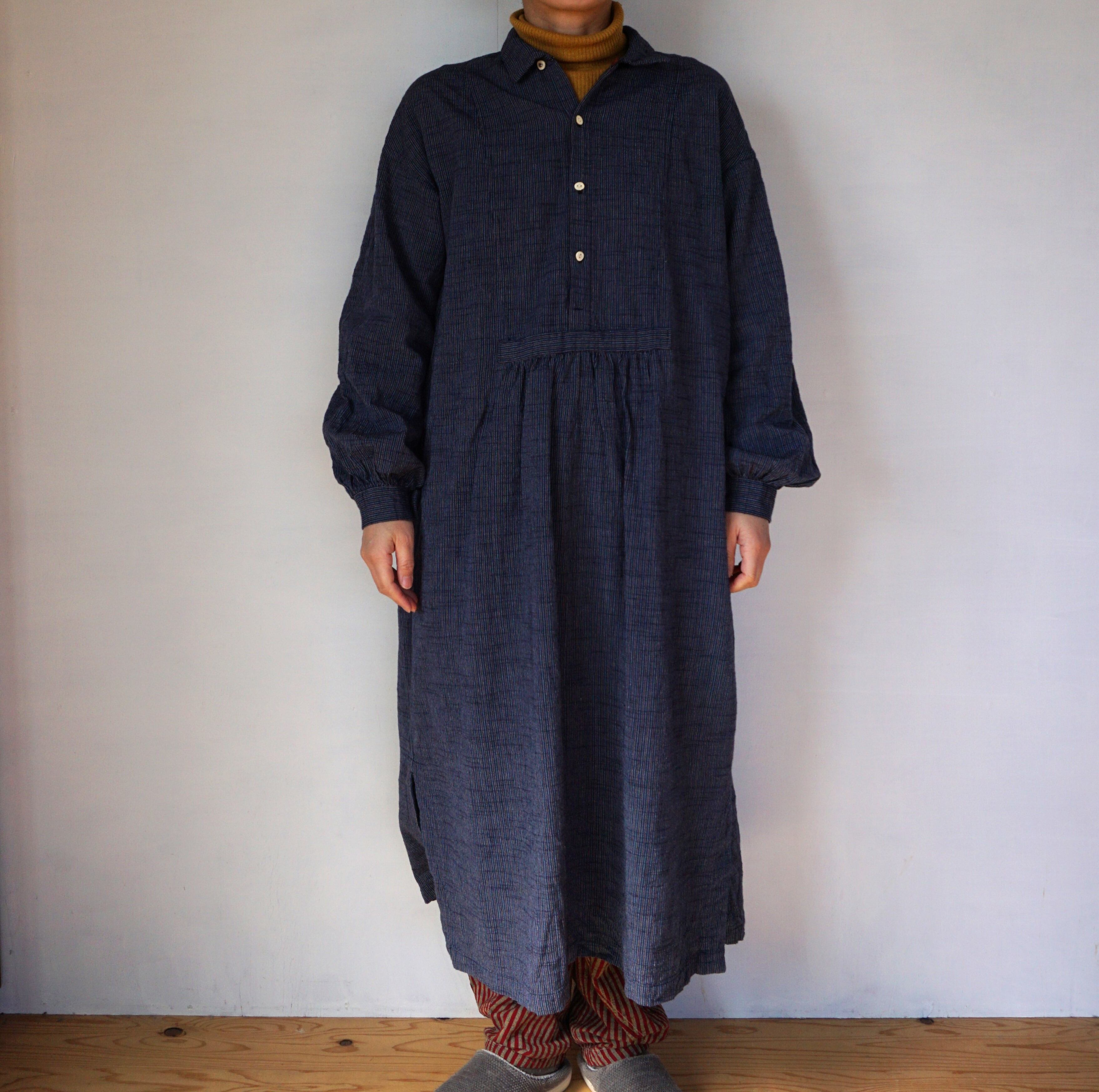 ヨーロッパのアンティークシャツを元に、現代の体形に合わせてパターンを改良したロングシャツです。ボリューミーなギャザーデザインは、シーンを選ばず着用できる優れもの。ワンピースとして着用したり、パンツと合わせるのもおすすめです。袖丈は+3㎝または+5㎝に変更可能です。