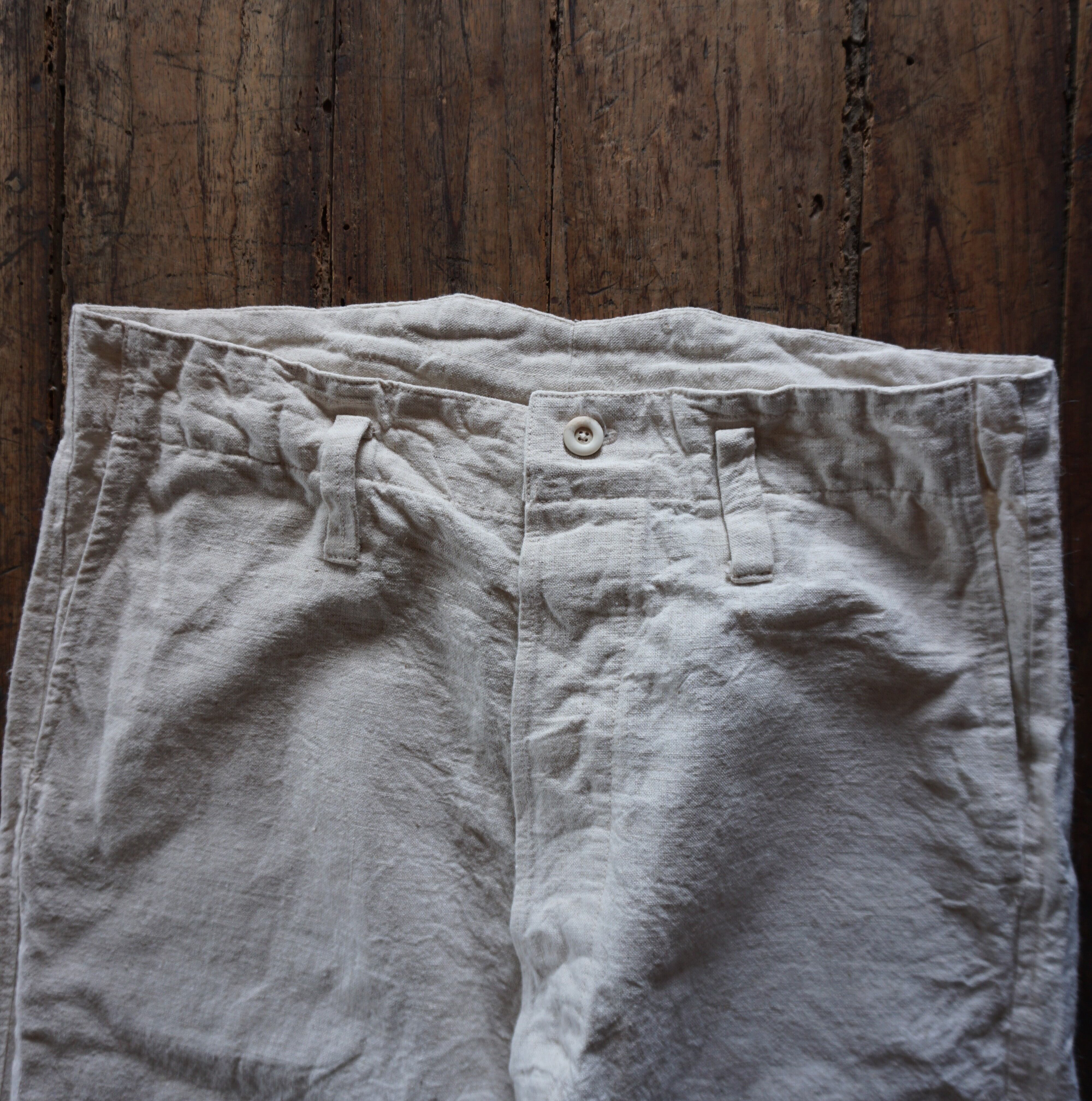 Crafted from Marubou hemp, a natural fiber slowly woven on a shuttle loom. The warp threads are 100% cotton, and the weft threads are 100% linen, creating a narrow-width textile born in Hamamatsu. Experience this cool cotton-linen blend that softens and molds to your body with each wear and wash. Please note that coarser linen fibers might feel a bit prickly at first. They will soften after 2-3 washes, so if you have sensitive skin, we recommend washing the pants a few times before wearing them.