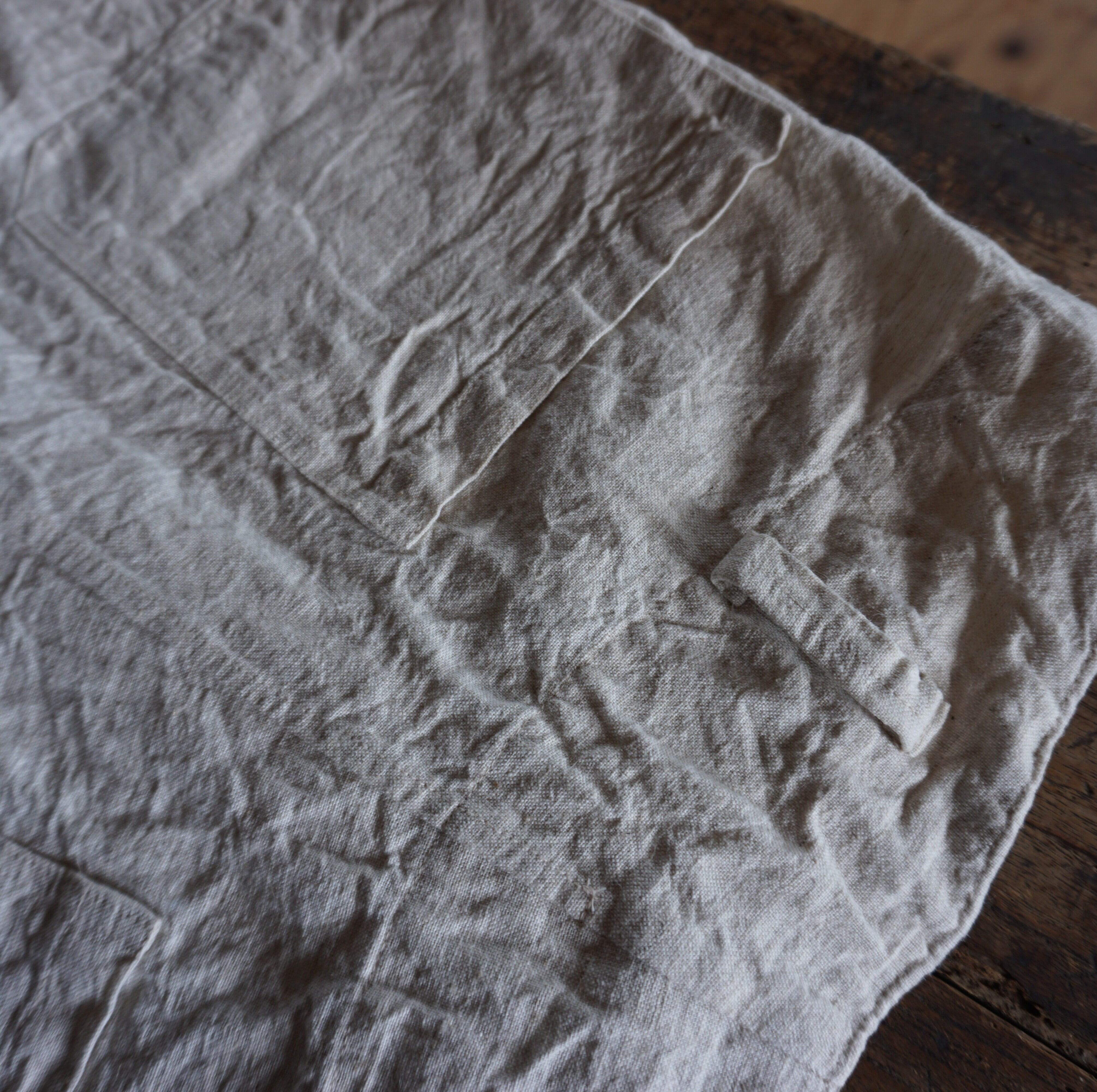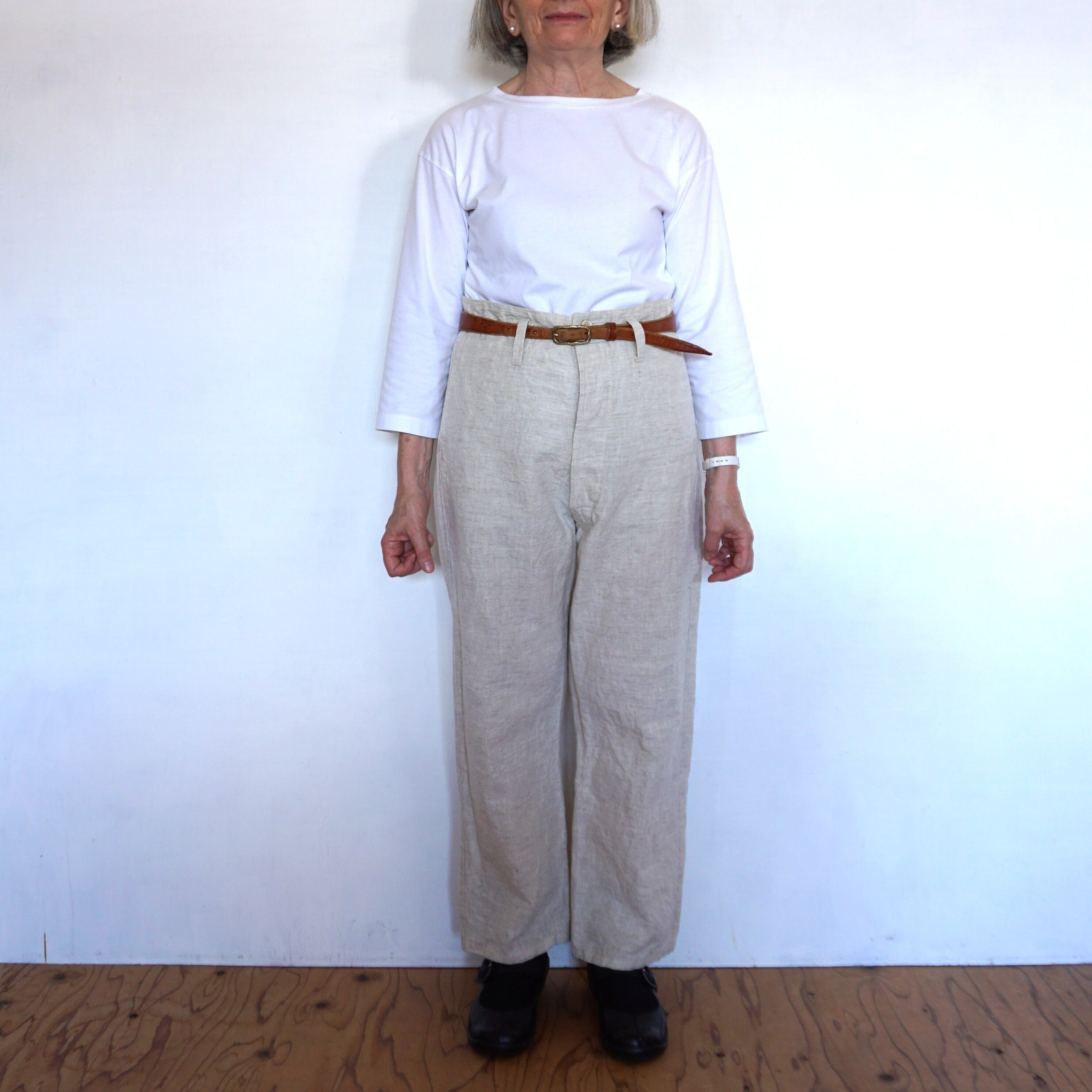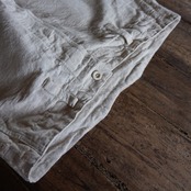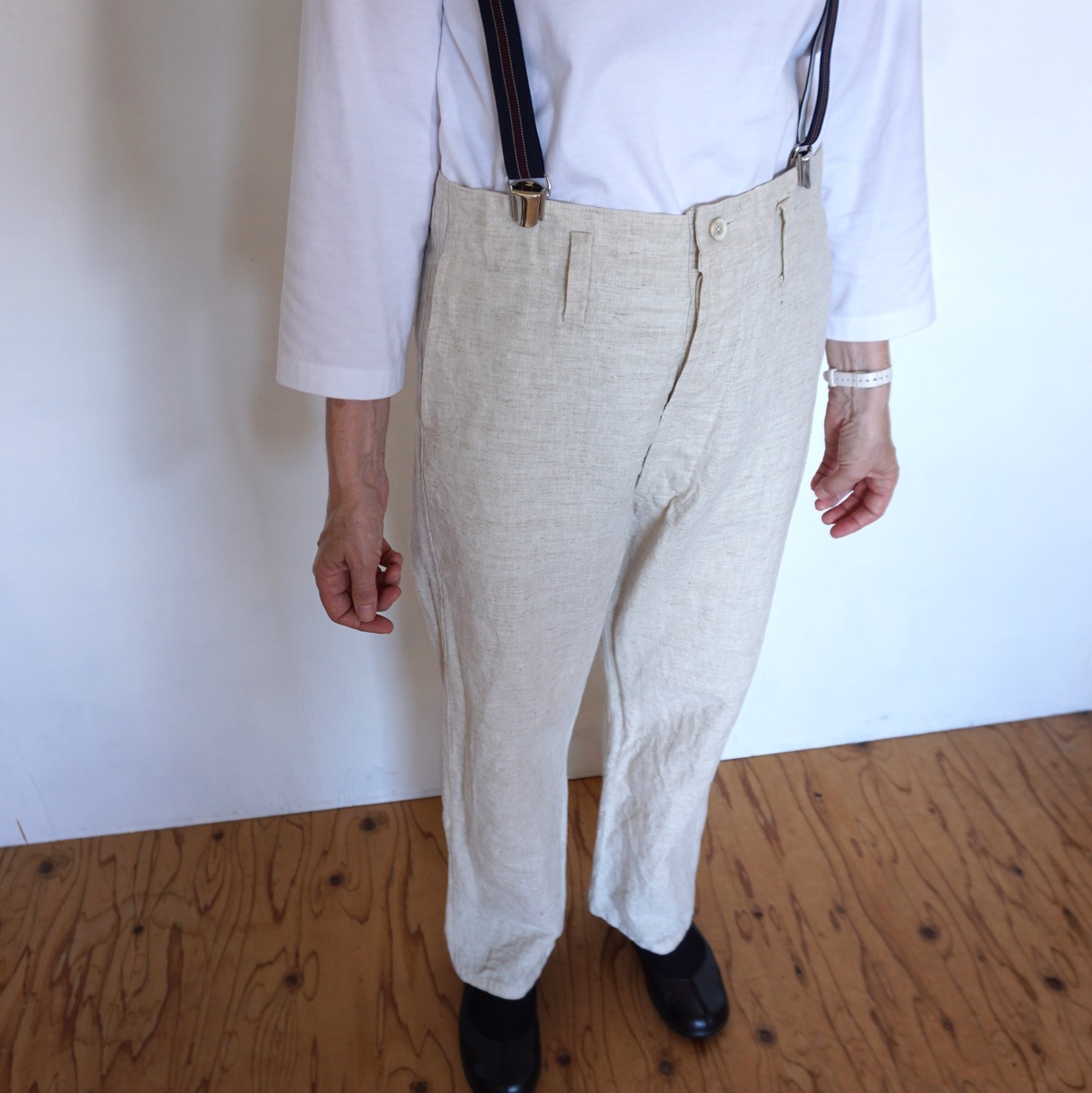 フランスのアンティークパンツをデザインソースにより履きやすく改良しました。ウエストはゆるめでサスペンダーあわせがおすすめです。股上は深くハイウエスト、ローウエストの着用可。サスペンダークリップ部分の内側に補強布を入れ厚みをだして耐久性を高めています。フロントはボタンフライ(比翼)、すべて鹿角ボタンを使用しています。