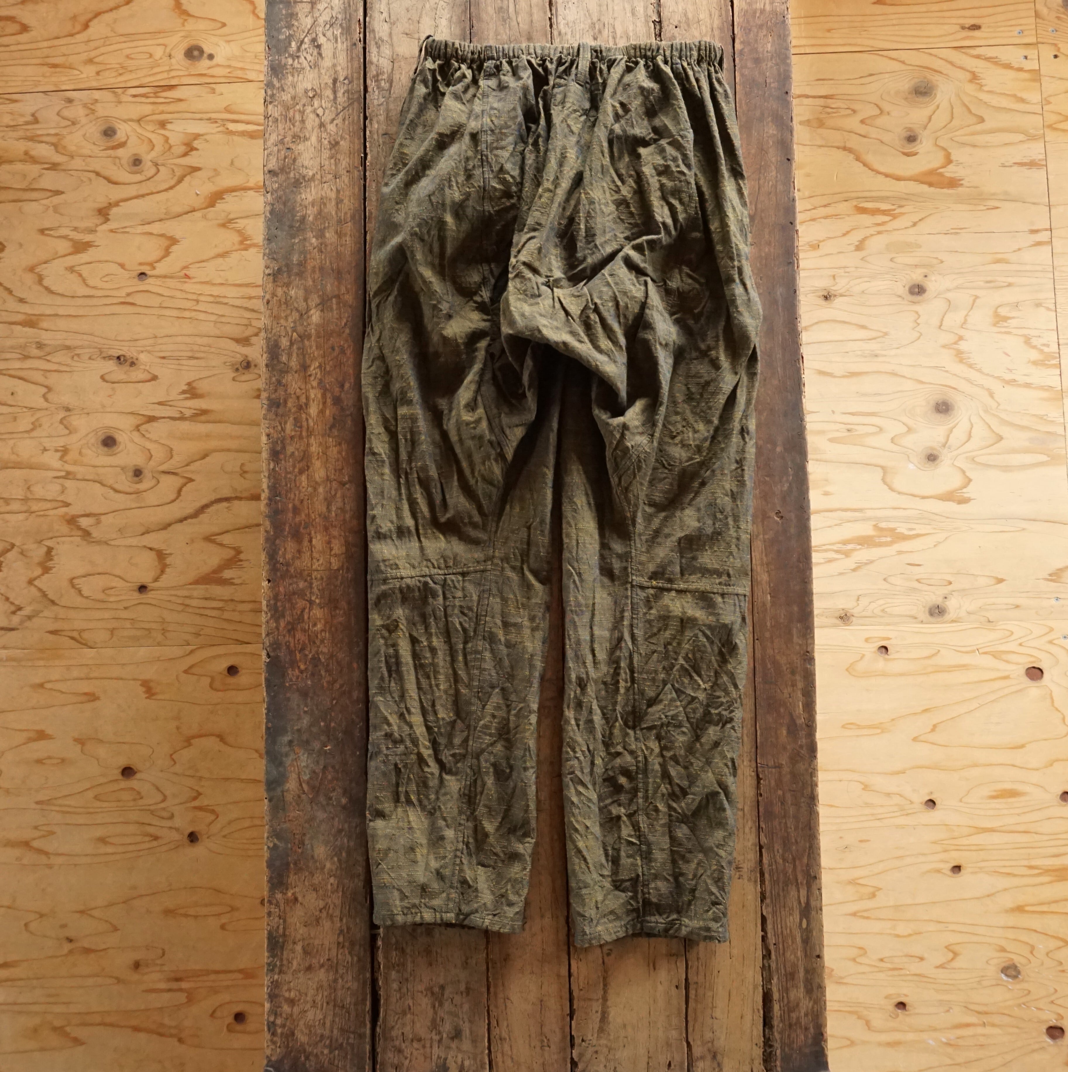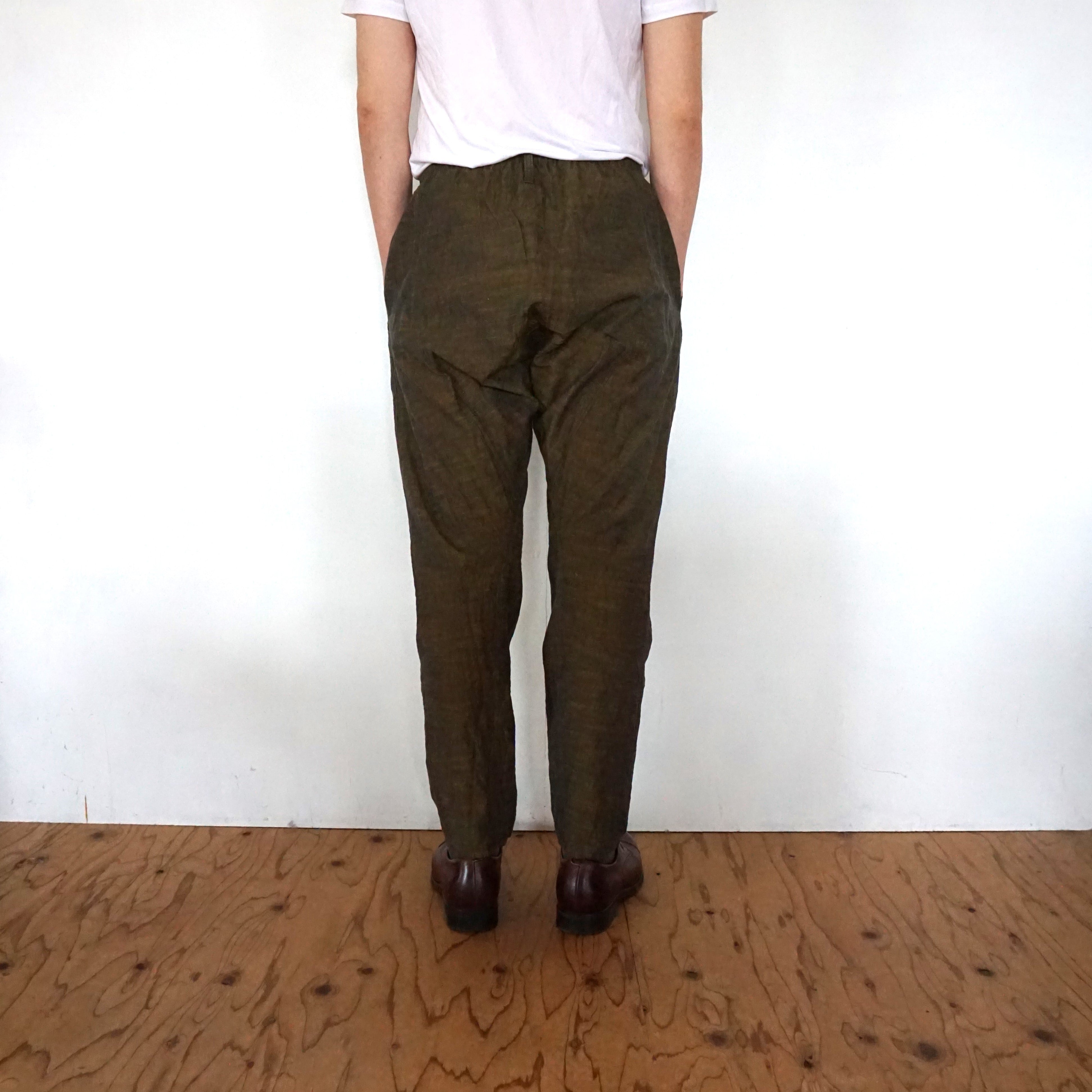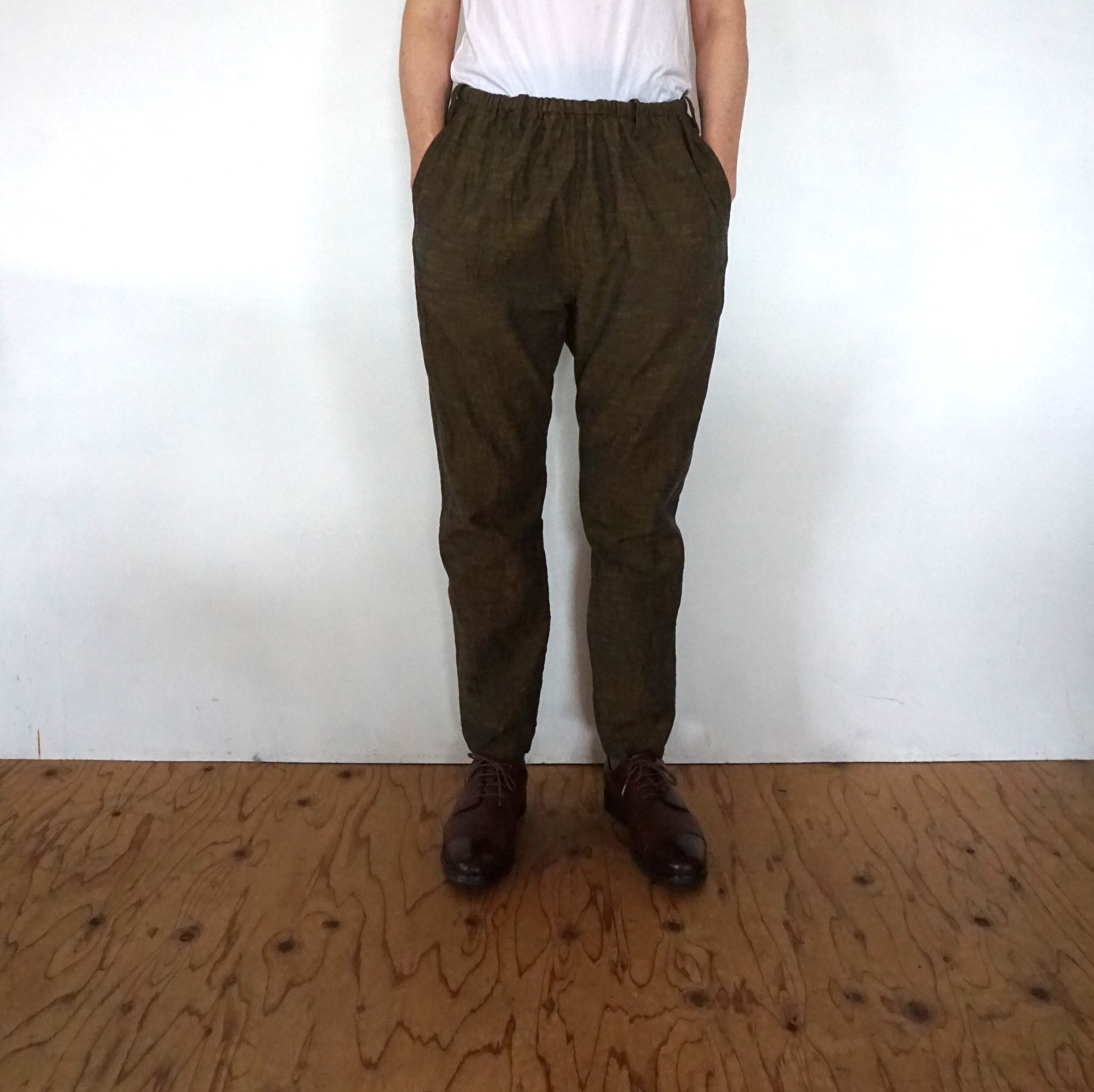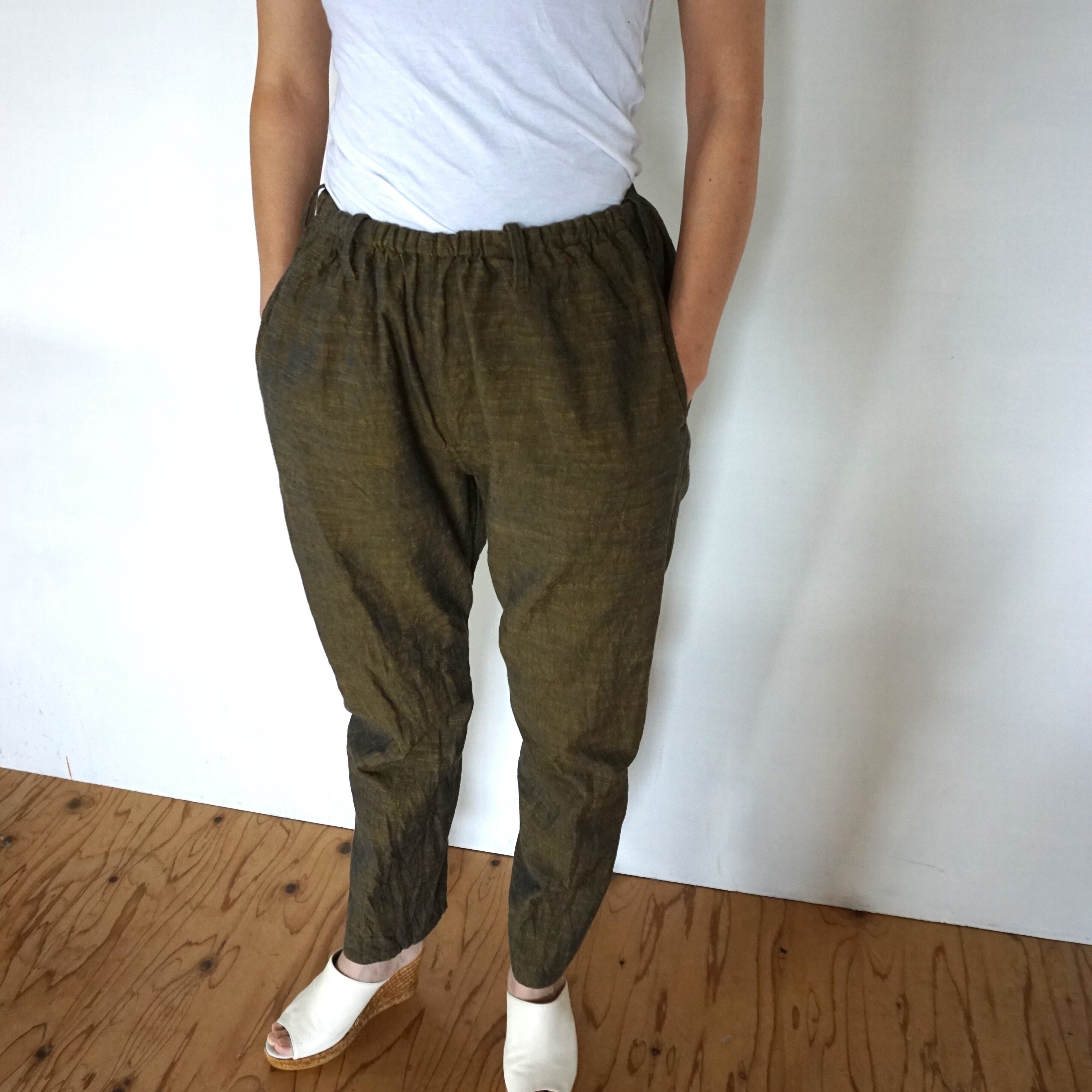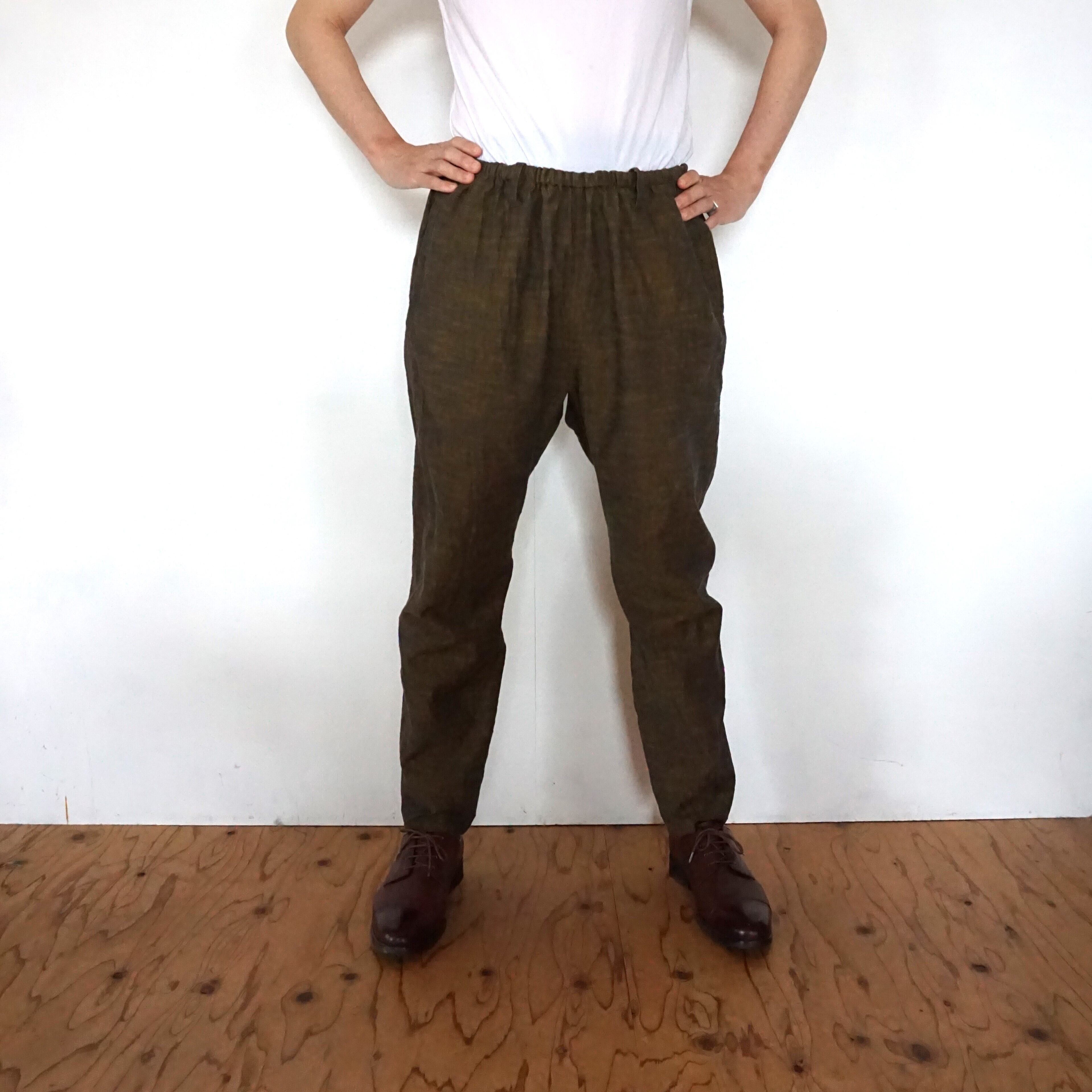 These pants are crafted from Aizu cotton, a natural fabric woven slowly on a shuttle loom. Aizu cotton is a lightweight, highly absorbent, and quick-drying textile that traps air, keeping you cool in summer and warm in winter. Originating from Aizuwakamatsu, this traditional narrow-width cotton fabric becomes softer with every wash, molding perfectly to your body and evolving into a truly unique piece over time.