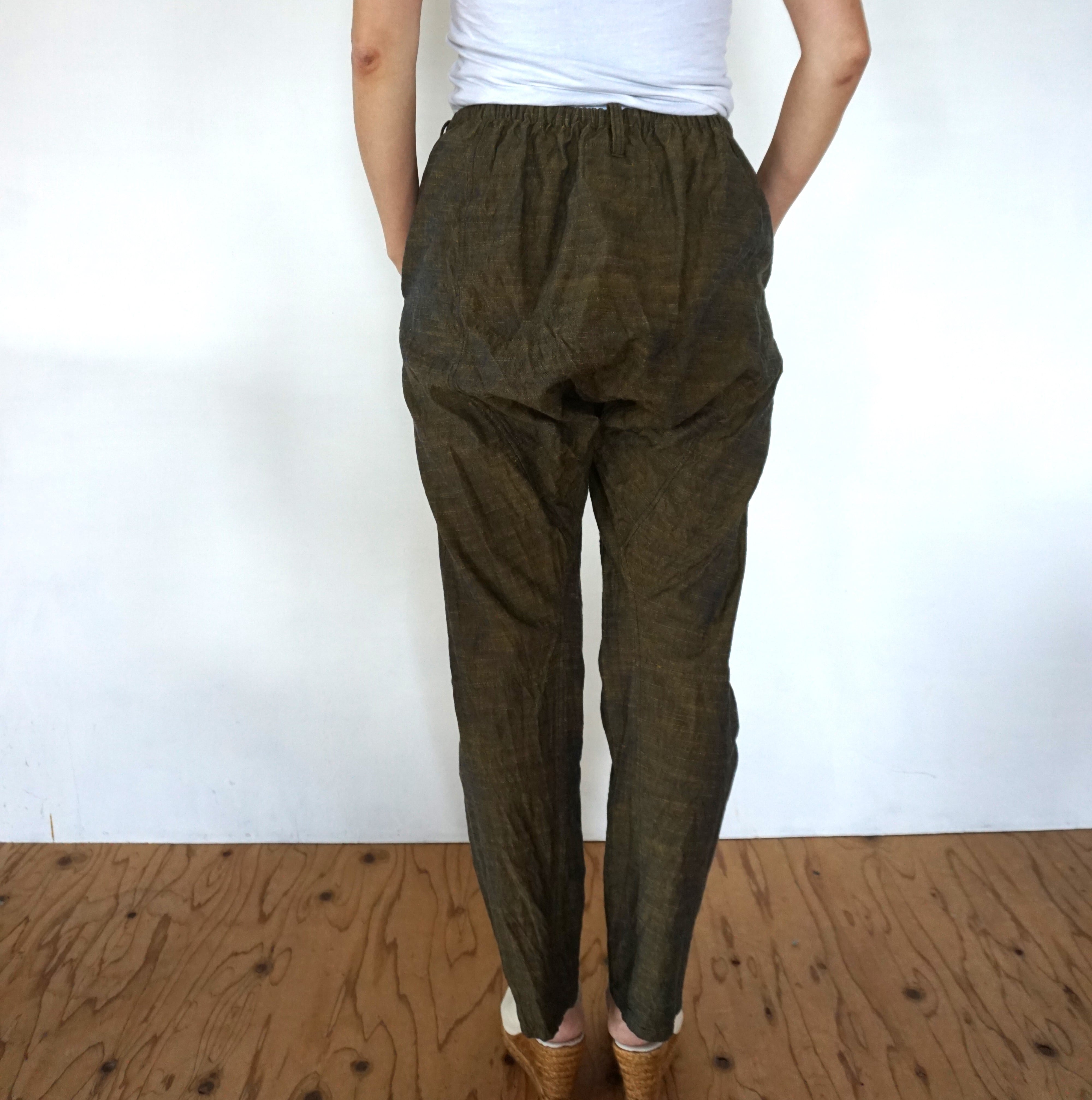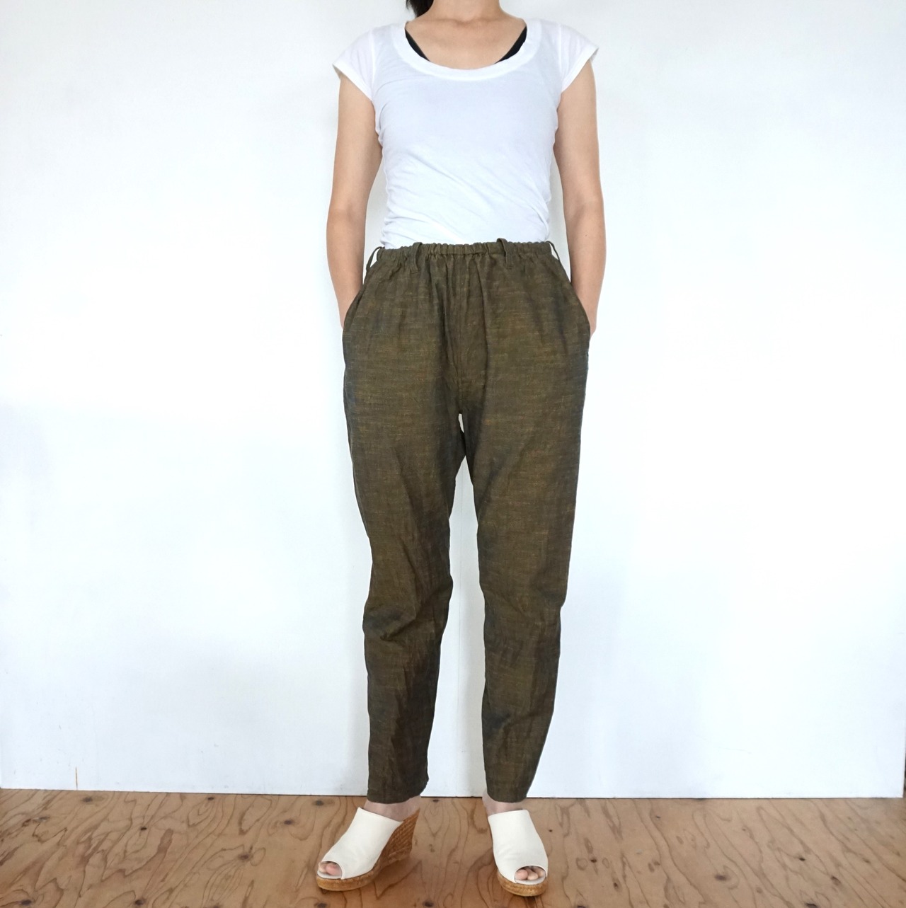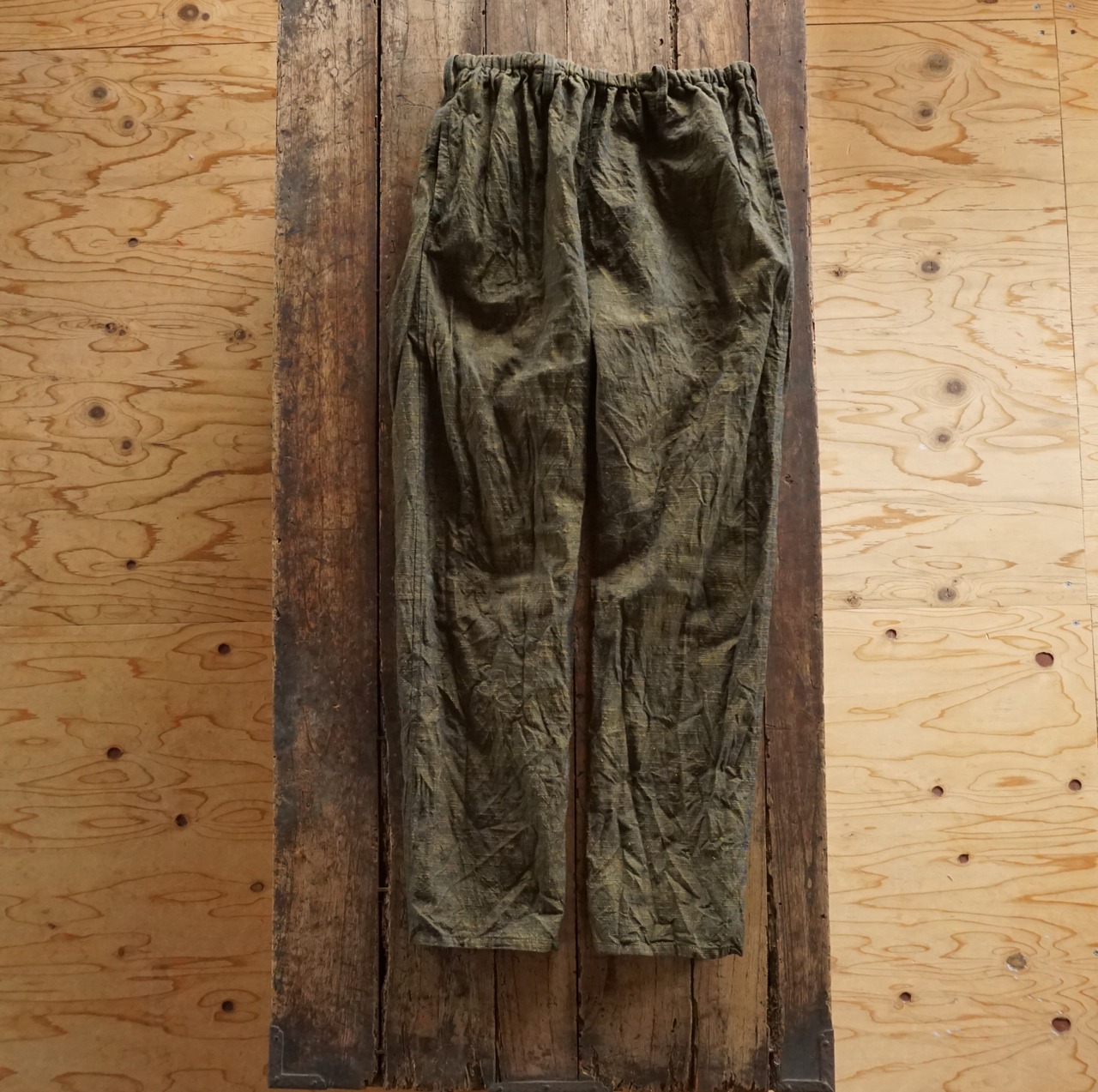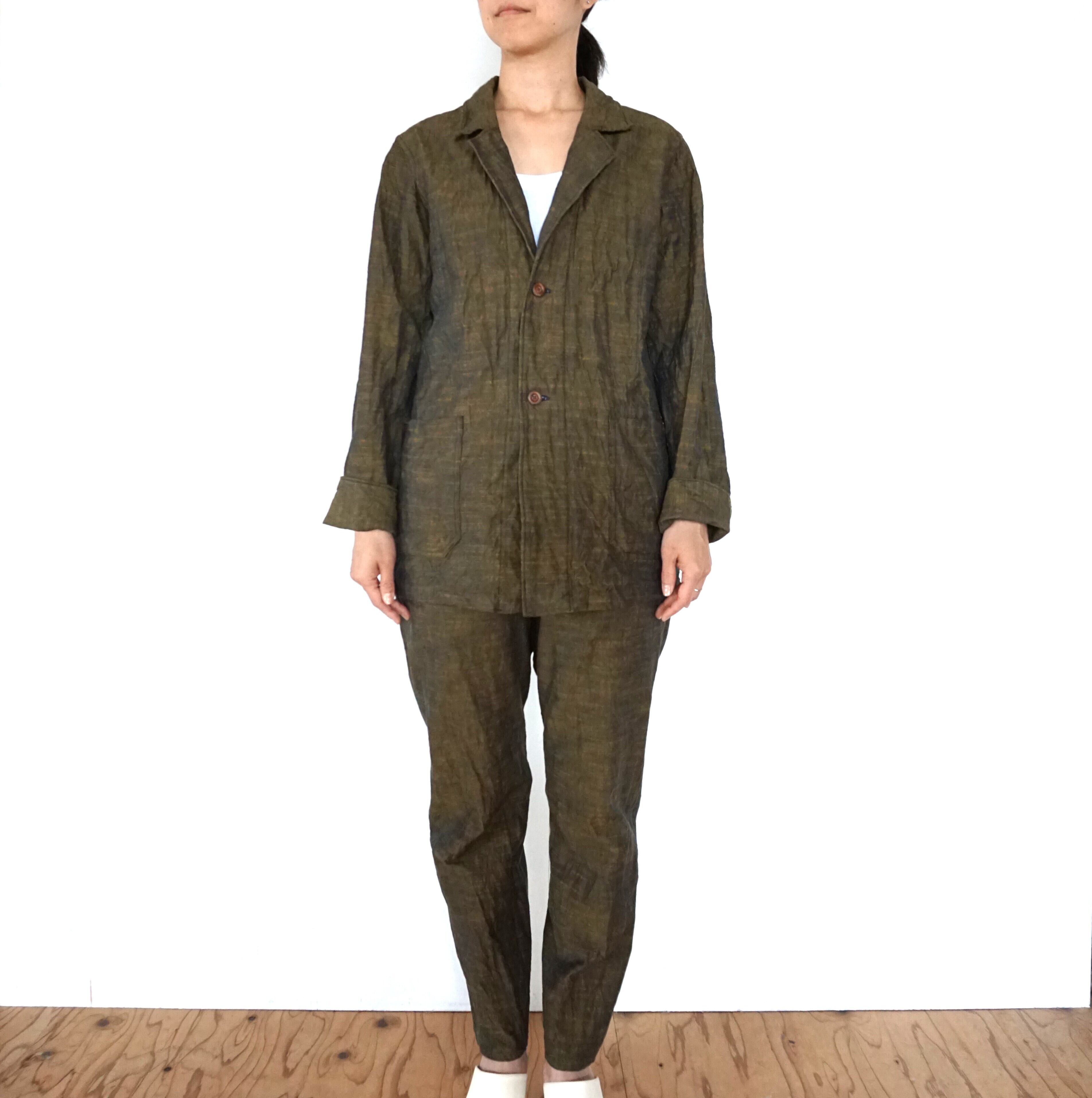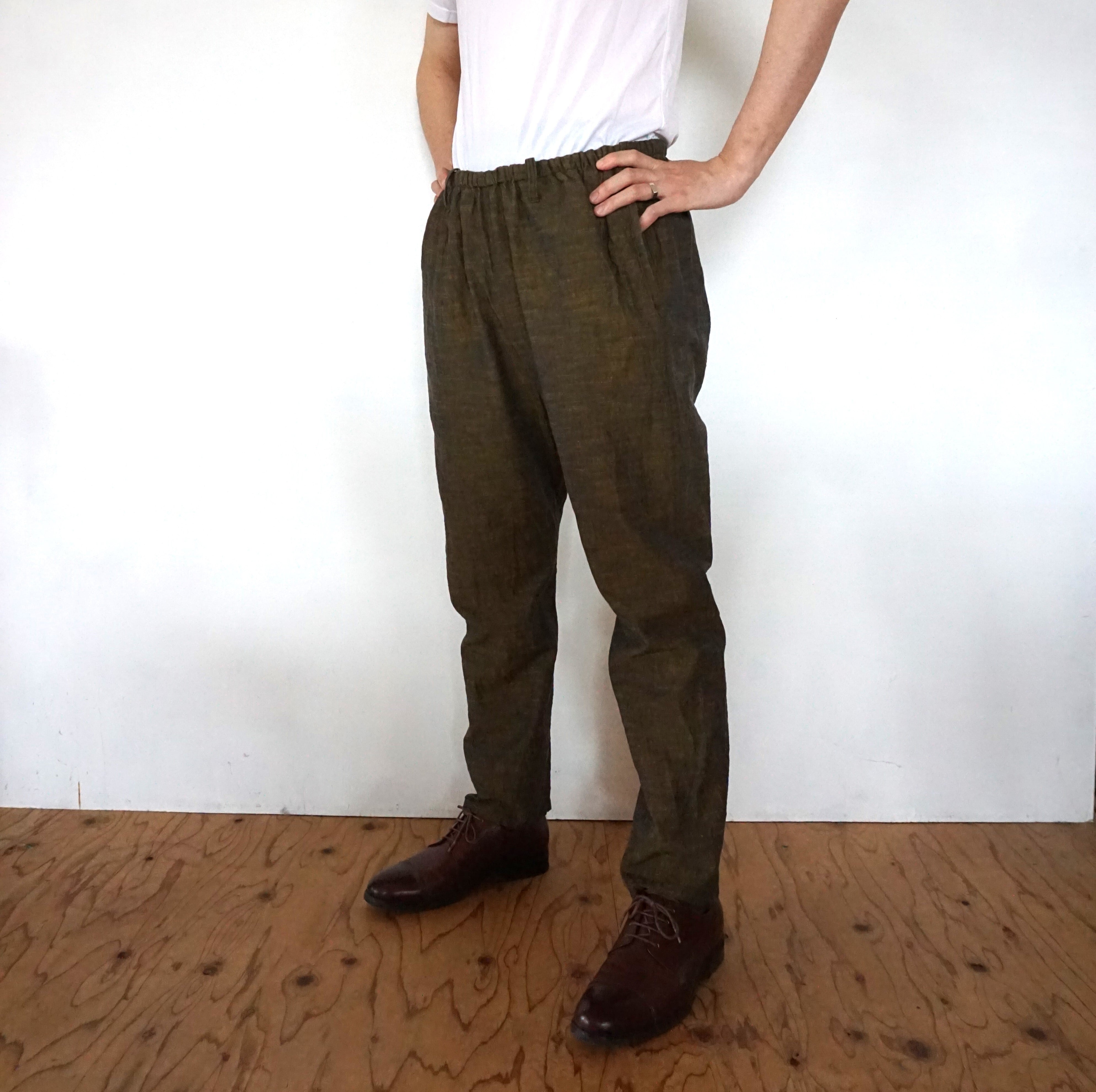 These pants are crafted from Aizu cotton, a natural fabric woven slowly on a shuttle loom. Aizu cotton is a lightweight, highly absorbent, and quick-drying textile that traps air, keeping you cool in summer and warm in winter. Originating from Aizuwakamatsu, this traditional narrow-width cotton fabric becomes softer with every wash, molding perfectly to your body and evolving into a truly unique piece over time.