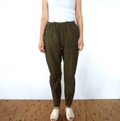 These Aizu cotton sarouel pants offer a relaxed fit while maintaining a sleek silhouette from the knees down. The design elongates the legs for a visually slimming effect, making them both comfortable and stylish.
